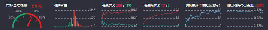 3、两市共2853只个股上涨,101只个股涨停,除新股外涨停92只;1194只个股下跌,7只个股跌停,19只股票炸板,炸板率20%。