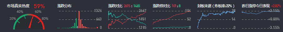 3、两市共2615只个股上涨,101只个股涨停,除新股外涨停93只;1465只个股下跌,8只个股跌停,20只股票炸板,炸板率22%。