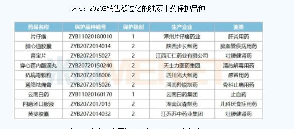 2020年9个独家中药保护品种预计销售额过亿 在中国城市实体药店终端,2020年预计销售额过亿的独家中药保护品种有9个,脑心通胶囊、黄葵胶囊、通络祛痛膏、四磨汤口服液榜上有名。据悉,2019年独家中药保护品种合计销售超200亿元。(米内网) 风险提示及免责条款 市场有风险,投资需谨慎。本文不构成个人投资建议,也未考虑到个别用户特殊的投资目标、财务状况或需要。用户应考虑本文中的任何意见、观点或结论是否符合其特定状况。据此投资,责任自负。