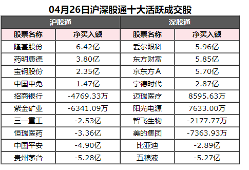 北上资金今日净买入隆基股份6.42亿元、爱尔眼科5.96亿元,净卖出贵州茅台5.28亿元、五粮液5.27亿元。 风险提示及免责条款 市场有风险,投资需谨慎。本文不构成个人投资建议,也未考虑到个别用户特殊的投资目标、财务状况或需要。用户应考虑本文中的任何意见、观点或结论是否符合其特定状况。据此投资,责任自负。