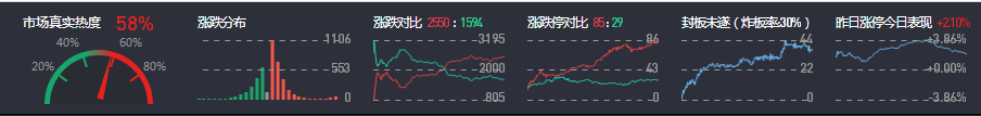 3、两市共2550只个股上涨,85只个股涨停,除新股外涨停74只;1594只个股下跌,29只个股跌停,27只股票炸板,炸板率30%。