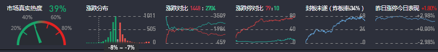 3、两市共1448只个股上涨,79只个股涨停,除新股外涨停69只;2704只个股下跌,10只个股跌停,28只股票炸板,炸板率34%。