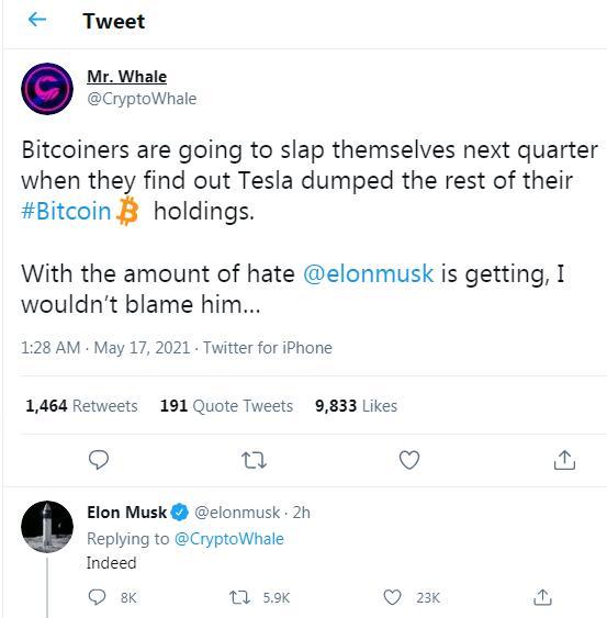 比特币一度跌破4.5万美元,马斯克暗示特斯拉可能清仓 有用户发推称,比特币的拥趸下个季度会被打脸,因为他们会发现特斯拉抛售所有剩余的所持比特币。马斯克回复这条推文称:确实。此后比特币一度跌破4.5万美元,较日内高位跌超5000美元。 风险提示及免责条款 市场有风险,投资需谨慎。本文不构成个人投资建议,也未考虑到个别用户特殊的投资目标、财务状况或需要。用户应考虑本文中的任何意见、观点或结论是否符合其特定状况。据此投资,责任自负。