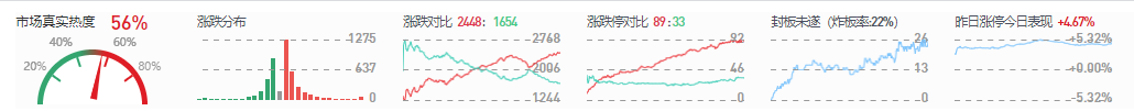 3、两市共2448只个股上涨,89只个股涨停,除新股外涨停80只;1654只个股下跌,33只个股跌停,18只股票炸板,炸板率22%。