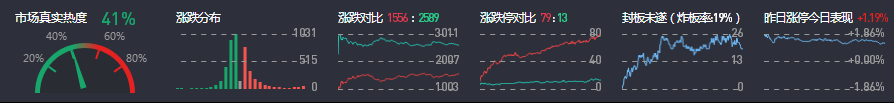 3、两市共1556只个股上涨,79只个股涨停,除新股外涨停71只;2589只个股下跌,13只个股跌停,16只股票炸板,炸板率19%。