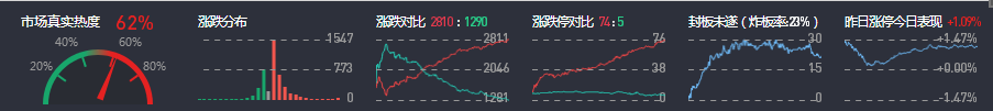 3、两市共2810只个股上涨,74只个股涨停,除新股外涨停68只;1290只个股下跌,5只个股跌停,16只股票炸板,炸板率23%。