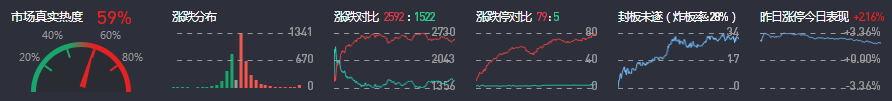 3、两市共2592只个股上涨,79只个股涨停,除新股外涨停69只;1522只个股下跌,5只个股跌停,26只股票炸板,炸板率28%。