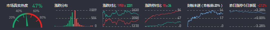 3、两市共1950只个股上涨,93只个股涨停,2231只个股下跌,26只个股跌停,18只股票炸板,炸板率23%。