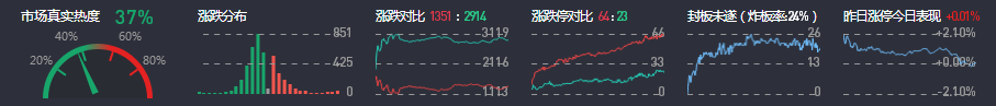 3、两市共1351只个股上涨,64只个股涨停,2914只个股下跌,23只个股跌停,13只股票炸板,炸板率24%。