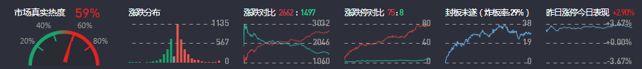 3、两市共2662只个股上涨,75只个股涨停,1497只个股下跌,8只个股跌停,19只股票炸板,炸板率29%。