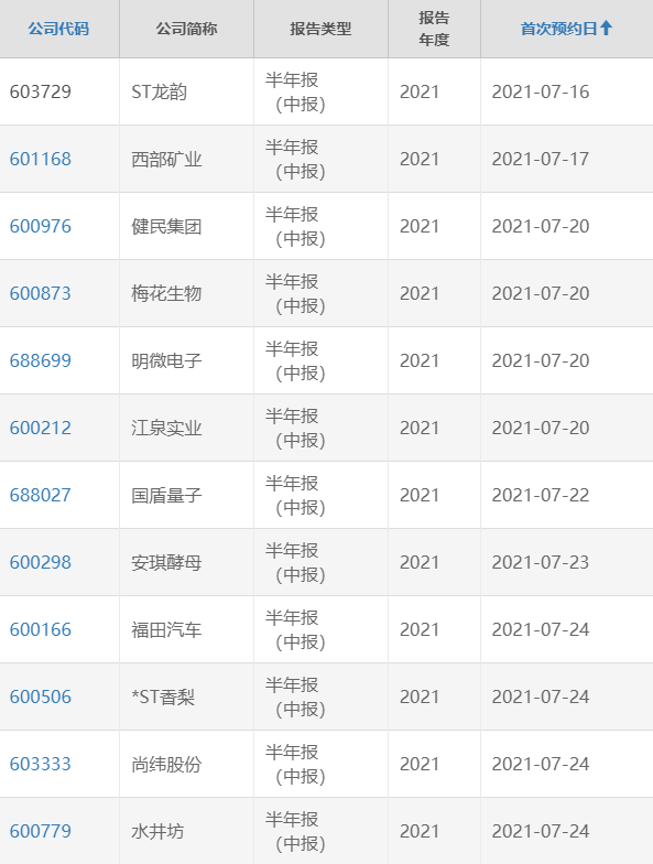 上交所半年报预约披露时间表出炉,ST龙韵拔得头筹,将于7月16日率先披露 此外,西部矿业将于7月17日披露,健民集团、梅花生物、明微电子、江泉实业将于7月20日披露。 风险提示及免责条款 市场有风险,投资需谨慎。本文不构成个人投资建议,也未考虑到个别用户特殊的投资目标、财务状况或需要。用户应考虑本文中的任何意见、观点或结论是否符合其特定状况。据此投资,责任自负。