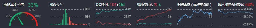 3、两市共1137只个股上涨,70只个股涨停,3141只个股下跌,4只个股跌停,15只股票炸板,炸板率20%。
