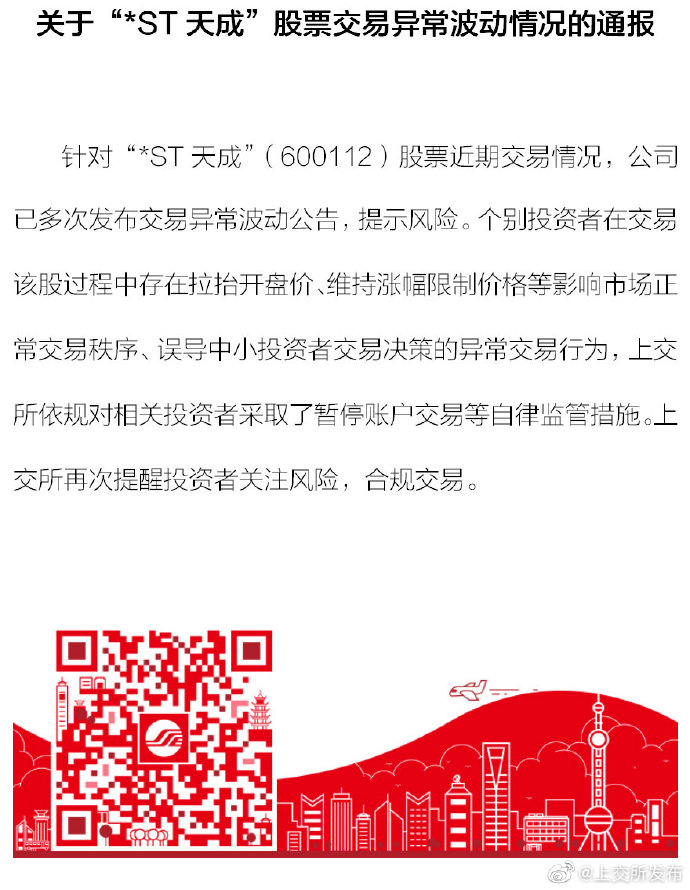 上交所:个别投资者在交易*ST天成股票过程中存在异常交易行为,对相关投资者已采取暂停账户交易等措施。 风险提示及免责条款 市场有风险,投资需谨慎。本文不构成个人投资建议,也未考虑到个别用户特殊的投资目标、财务状况或需要。用户应考虑本文中的任何意见、观点或结论是否符合其特定状况。据此投资,责任自负。