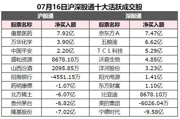 北上资金今日净买入复星医药7.92亿元、京东方A 7.47亿元,净卖出宁德时代9.58亿元、隆基股份7.02亿元。 风险提示及免责条款 市场有风险,投资需谨慎。本文不构成个人投资建议,也未考虑到个别用户特殊的投资目标、财务状况或需要。用户应考虑本文中的任何意见、观点或结论是否符合其特定状况。据此投资,责任自负。