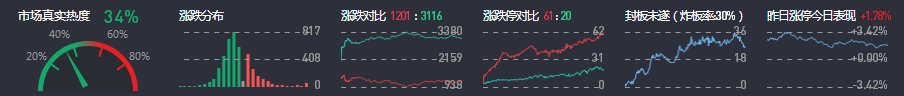 3、两市共1201只个股上涨,61只个股涨停,3116只个股下跌,20只个股跌停,19只股票炸板,炸板率30%。