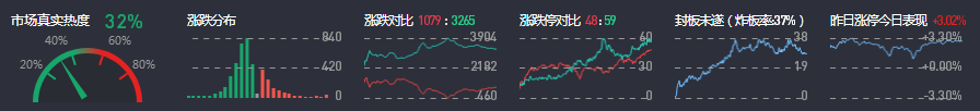 3、两市共1079只个股上涨,48只个股涨停,3265只个股下跌,59只个股跌停,21只股票炸板,炸板率37%。