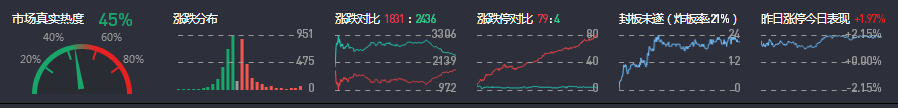3、两市共1831只个股上涨,79只个股涨停,2436只个股下跌,4只个股跌停,19只股票炸板,炸板率21%。