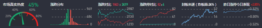 3、两市共1843只个股上涨,82只个股涨停,2419只个股下跌,4只个股跌停,22只股票炸板,炸板率24%。