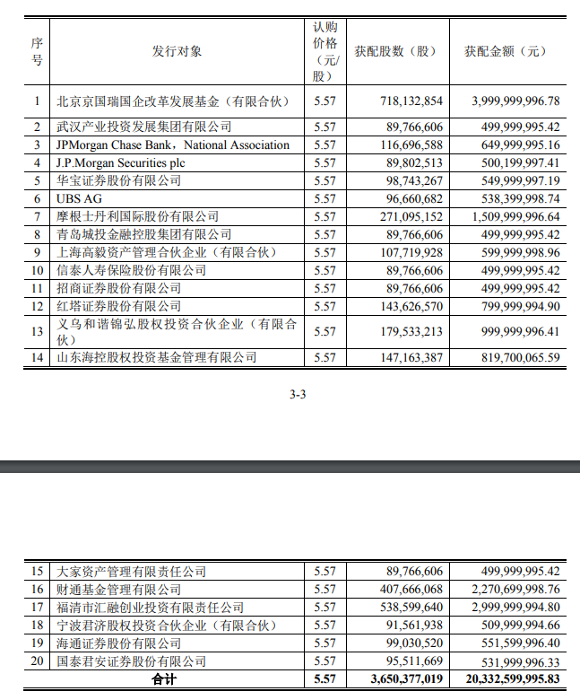 京东方A披露定增发行情况报告书:发行价格5.57元/股,募资总额203.3亿元,其中北京京国瑞国企改革发展基金获配40亿元、JP Morgan合计获配11.5亿元、摩根士丹利获配15亿元。 风险提示及免责条款 市场有风险,投资需谨慎。本文不构成个人投资建议,也未考虑到个别用户特殊的投资目标、财务状况或需要。用户应考虑本文中的任何意见、观点或结论是否符合其特定状况。据此投资,责任自负。