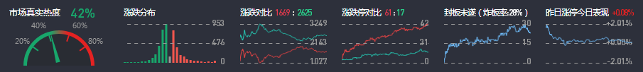 3、两市共1669只个股上涨,61只个股涨停,2625只个股下跌,17只个股跌停,16只股票炸板,炸板率28%。