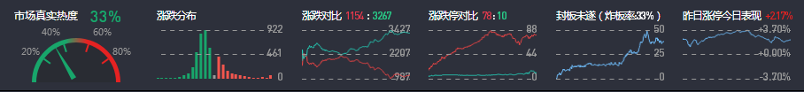 3、两市共1154只个股上涨,78只个股涨停,3267只个股下跌,10只个股跌停,31只股票炸板,炸板率33%。