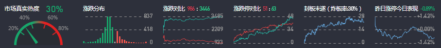 3、两市共986只个股上涨,51只个股涨停,3446只个股下跌,63只个股跌停,17只股票炸板,炸板率30%。