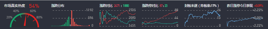 3、两市共2471只个股上涨,87只个股涨停,1880只个股下跌,23只个股跌停,15只股票炸板,炸板率17%。