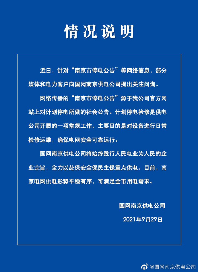 国网南京供电公司:网传停电实为常规检修工作 国网南京供电公司官方微博发布情况说明:网络传播的“南京市停电公告”源于公司官方网站上对计划停电所做的社会公告,计划停电检修是供电公司开展的一项常规工作。目前。南京电网供电形势平稳有序,可满足全市用电需求。 风险提示及免责条款 市场有风险,投资需谨慎。本文不构成个人投资建议,也未考虑到个别用户特殊的投资目标、财务状况或需要。用户应考虑本文中的任何意见、观点或结论是否符合其特定状况。据此投资,责任自负。
