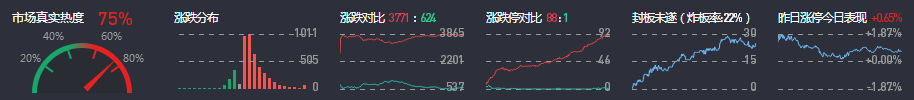 3、两市共3771只个股上涨,88只个股涨停,624只个股下跌,1只个股跌停,只股票炸板,炸板率22%。