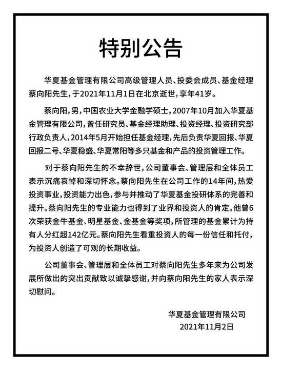 华夏基金蔡向阳不幸辞世 华夏基金公告,华夏基金管理有限公司高级管理人员、投委会成员、基金经理蔡向阳先生,于2021年11月1日在北京逝世,享年41岁。 风险提示及免责条款 市场有风险,投资需谨慎。本文不构成个人投资建议,也未考虑到个别用户特殊的投资目标、财务状况或需要。用户应考虑本文中的任何意见、观点或结论是否符合其特定状况。据此投资,责任自负。