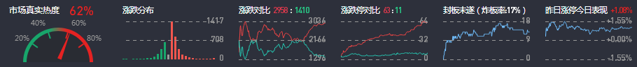 3、两市共2958只个股上涨,63只个股涨停,1410只个股下跌,11只个股跌停,12只股票炸板,炸板率17%。