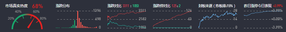 3、两市共3311只个股上涨,125只个股涨停,1053只个股下跌,2只个股跌停,16只股票炸板,炸板率15%。