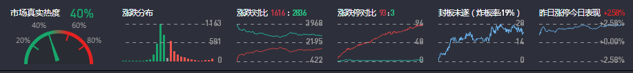 3、两市共1616只个股上涨,93只个股涨停,2836只个股下跌,3只个股跌停,19只股票炸板,炸板率19%。