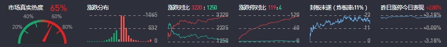 3、两市共3220只个股上涨,119只个股涨停,1250只个股下跌,4只个股跌停,11只股票炸板,炸板率11%。