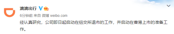 滴滴出行官方微博 :经认真研究,公司即日起启动在纽交所退市的工作,并启动在香港上市的准备工作。 风险提示及免责条款 市场有风险,投资需谨慎。本文不构成个人投资建议,也未考虑到个别用户特殊的投资目标、财务状况或需要。用户应考虑本文中的任何意见、观点或结论是否符合其特定状况。据此投资,责任自负。
