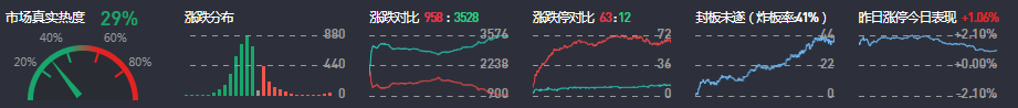 3、两市共958只个股上涨,63只个股涨停,3528只个股下跌,12只个股跌停,28只股票炸板,炸板率41%。