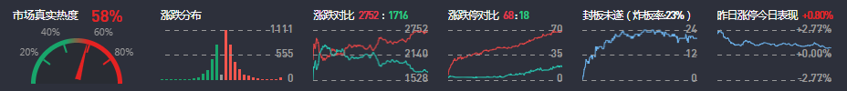 3、两市共2752只个股上涨,68只个股涨停,1716只个股下跌,18只个股跌停,16只股票炸板,炸板率23%。