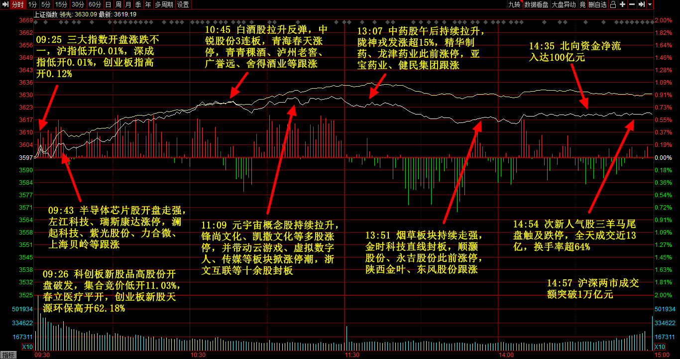 主力净流入行业板块前五:券商,半导体,大金融,国产芯片,手游;
