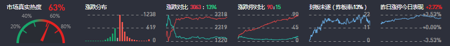 3、两市共3063只个股上涨,90只个股涨停,1394只个股下跌,15只个股跌停,12只股票炸板,炸板率13%。