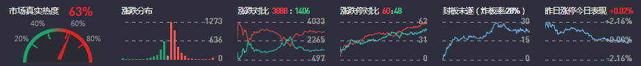 3、两市共3088只个股上涨,60只个股涨停,1406只个股下跌,48只个股跌停,19只股票炸板,炸板率28%。