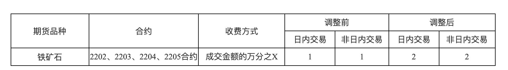 大商所:自2月16日(即2月15日夜盘交易小节)起,对铁矿石期货2202、2203、2204和2205合约手续费费率由成交金额的万分之1调整为万分之2。 风险提示及免责条款 市场有风险,投资需谨慎。本文不构成个人投资建议,也未考虑到个别用户特殊的投资目标、财务状况或需要。用户应考虑本文中的任何意见、观点或结论是否符合其特定状况。据此投资,责任自负。