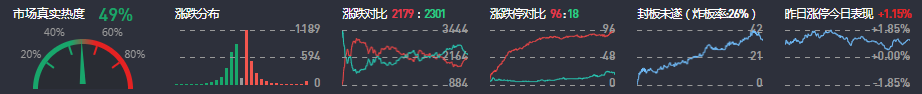3、两市共2179只个股上涨,96只个股涨停,2301只个股下跌,18只个股跌停,28只股票炸板,炸板率26%。