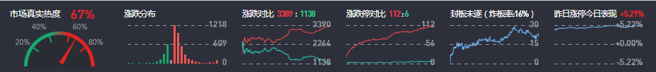 3、两市共3389只个股上涨,112只个股涨停,1138只个股下跌,6只个股跌停,17只股票炸板,炸板率16%。