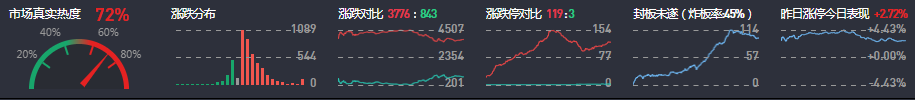 3、两市共3776只个股上涨,119只个股涨停,843只个股下跌,3只个股跌停,89只股票炸板,炸板率45%。