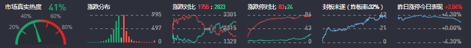 3、两市共1755只个股上涨,83只个股涨停,2823只个股下跌,24只个股跌停,38只股票炸板,炸板率32%。