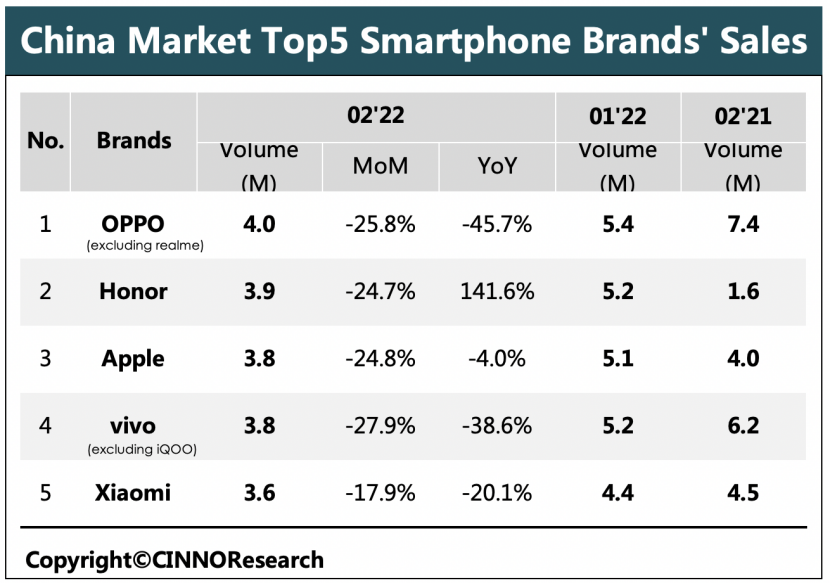 据CINNO Research统计数据显示,2月中国市场智能手机销量约2348万部,同比下滑了20.5%,环比下滑24.0%,同比环比双双出现收缩。国内智能机销量排名第一和第二分别为OPPO和荣耀,与1月份的排名对比来看,Top 5品牌的位置有所变化,荣耀排名升至第二,苹果紧随其后,vivo跌落至第四,小米依然处于第五位置。