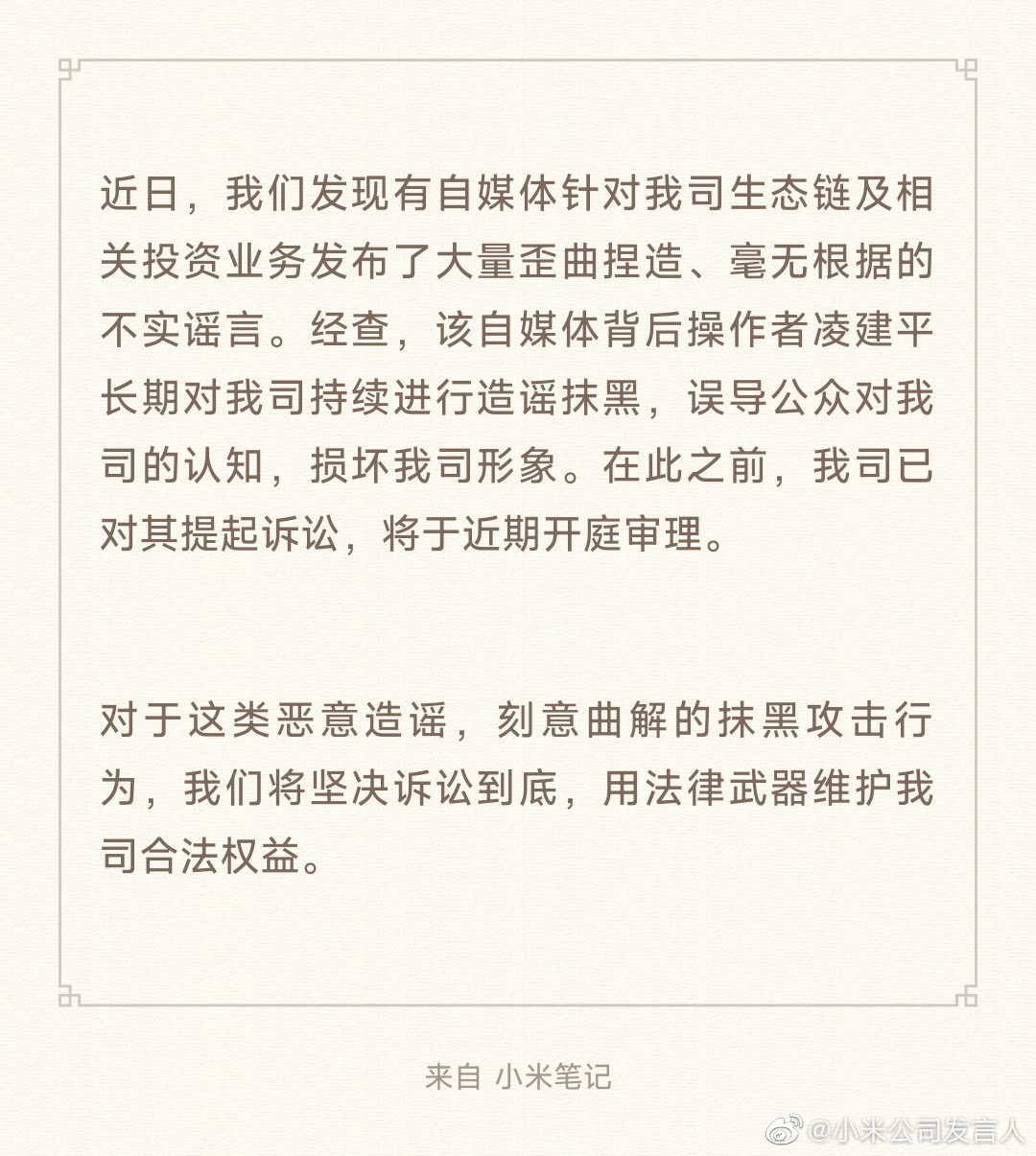 小米公司发言人:发现有自媒体针对我司生态链及相关投资业务发布了大量歪曲捏造、毫无根据的不实谣言,已对该自媒体背后操作者凌建平提起诉讼,将于近期开庭审理。 风险提示及免责条款 市场有风险,投资需谨慎。本文不构成个人投资建议,也未考虑到个别用户特殊的投资目标、财务状况或需要。用户应考虑本文中的任何意见、观点或结论是否符合其特定状况。据此投资,责任自负。