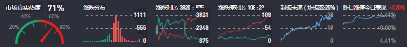 3、两市共3820只个股上涨,108只个股涨停,875只个股下跌,23只个股跌停,33只股票炸板,炸板率25%。
