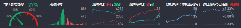 3、两市共849只个股上涨,59只个股涨停,3858只个股下跌,61只个股跌停,41只股票炸板,炸板率43%。