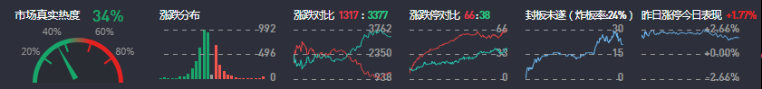 3、两市共1317只个股上涨,66只个股涨停,3377只个股下跌,38只个股跌停,18只股票炸板,炸板率24%。